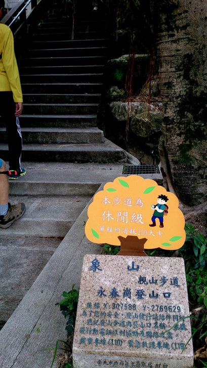 0746象山步道登山口。開始階梯陡上。陪著家人走的好處就是不用趕,路ㄟ樂得輕鬆取階緩上,一段陡坡下來,竟也不覺氣喘與流汗。