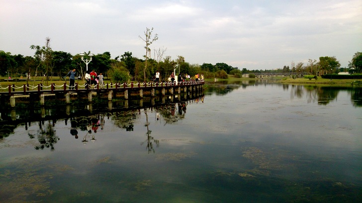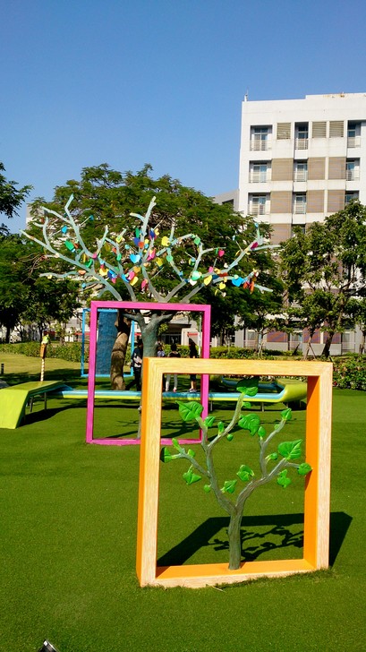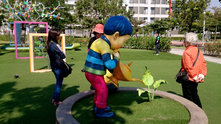 南科的幾米公園---許諾之地。是台積電捐地設立的小公園,佔地小而美,從小樹紮根灌溉到大樹成長,是一個印象清楚,環境雅致的地方,僅鄰著南科霞客湖,卻是天氣太熱,沒有人想要環湖散步。