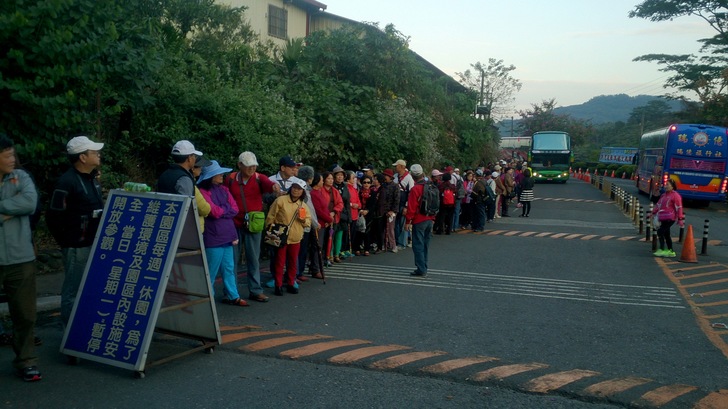 回到接駁車搭車處,等候接駁車。遊覽車隨車導遊在前面佔位置,姍姍來遲的遊客,卻被"導遊"引領到前面插隊,已經在大太陽下等了快一小時,路ㄟ整個火都上來,當場與"導遊"吵了起來,導遊自知理虧,只好安排後到的客人依序排隊。其實,主辦單位既然提早放行,應該聯絡接駁公車提早接駁,卻遲遲等不到公車,才會造成枯等一個多小時的亂像。