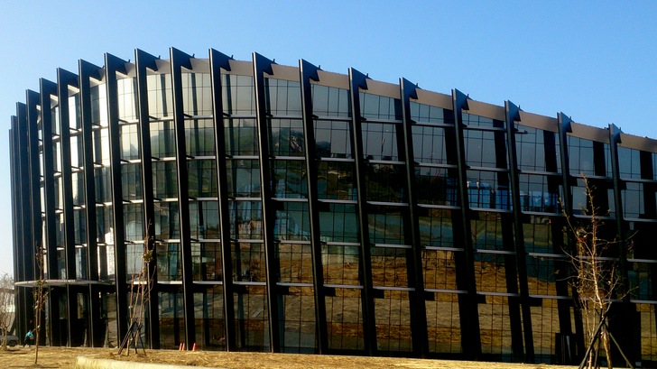 湖光倒影在主館的玻璃幕屏上,顯得耀眼奪目。