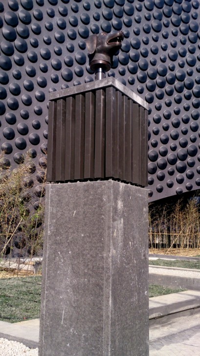 引起軒然大波的十二獸首贗品,就在主館入口處,昨天有情侶潑漆事件,工作人員還在清洗,現在也加派保全看守,新聞媒體今天仍有採訪記者到訪。