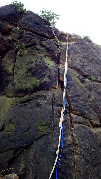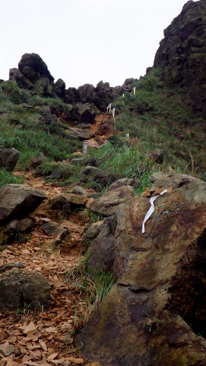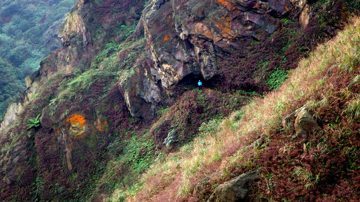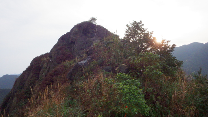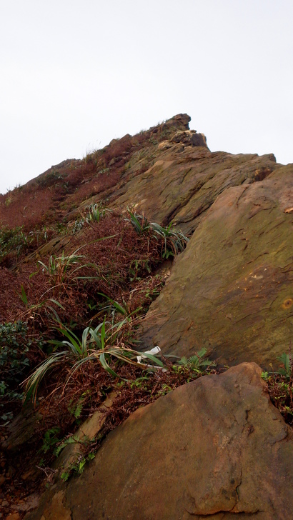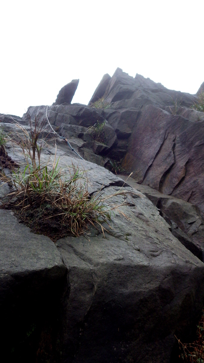 0737四叉路(H170M)。直行往小錐麓、小鬼瀑布,右往劍龍稜,左邊一座小山頭,看起來雄偉,取左行。攀岩陡上,接近山頂的垂直山壁,有繩可拉,卻無明顯踩點,小心上。