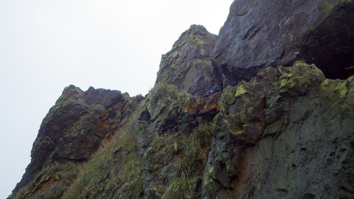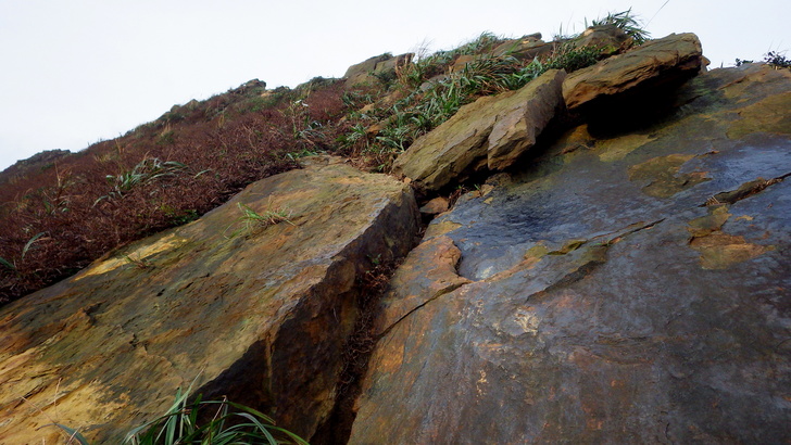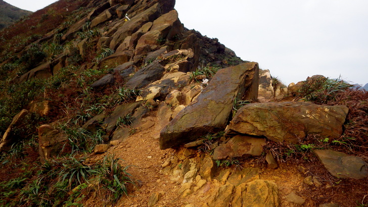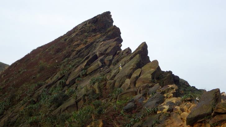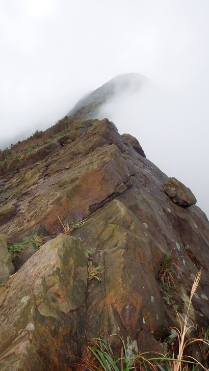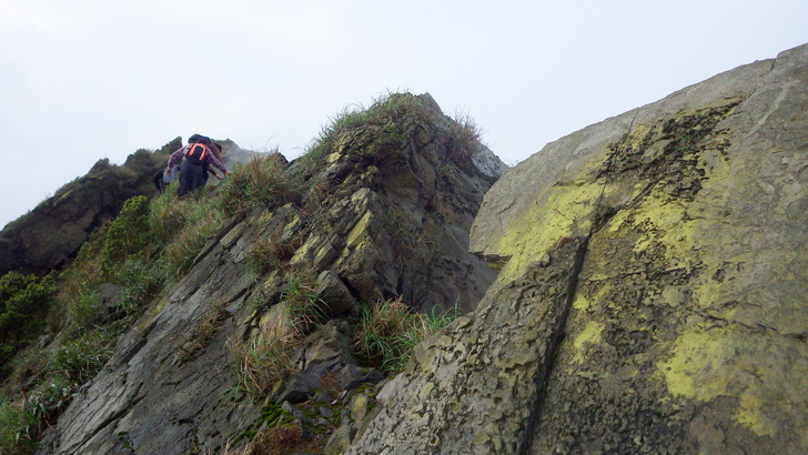 0800出發。順著稜線踩著石縫上行。毫無遮蔽的狹窄瘦稜,有頗大的曝露感,安全起見,小心翼翼,攀岩縫,踏石緣,踩小徑緩慢前進。
