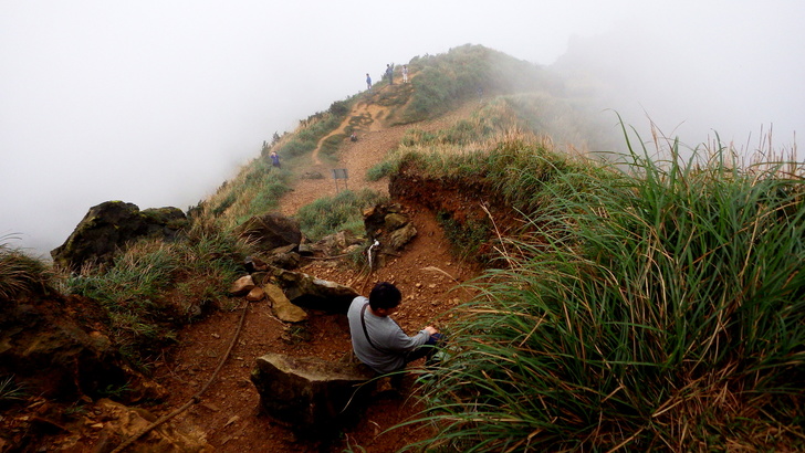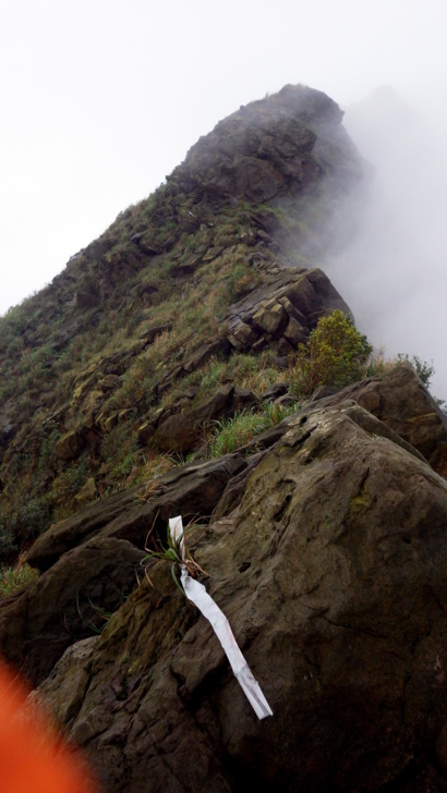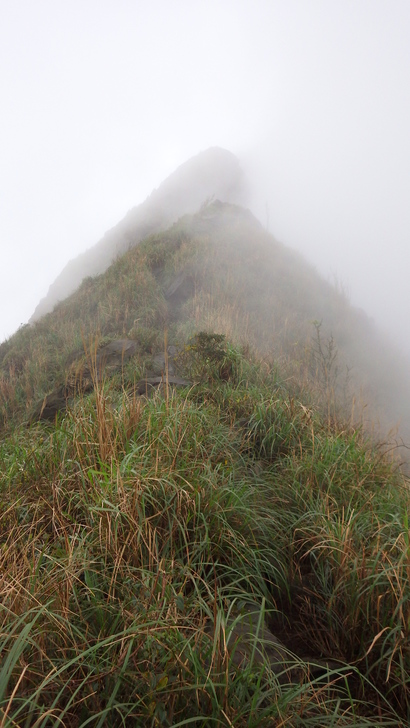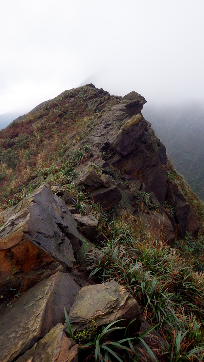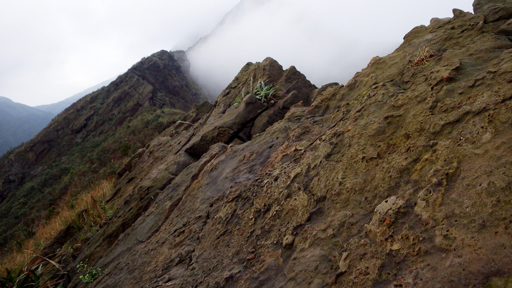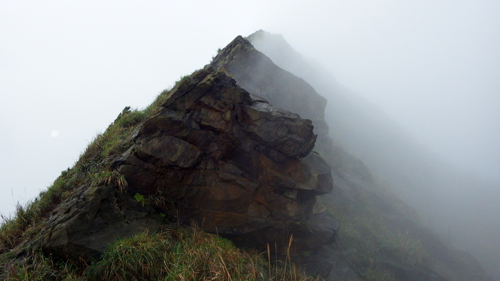 0940啟程續行。仍舊在危險瘦稜中前進,霧越濃,雖然越耽心,遮蔽了危險路徑也未嘗不是一件好事。