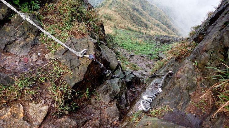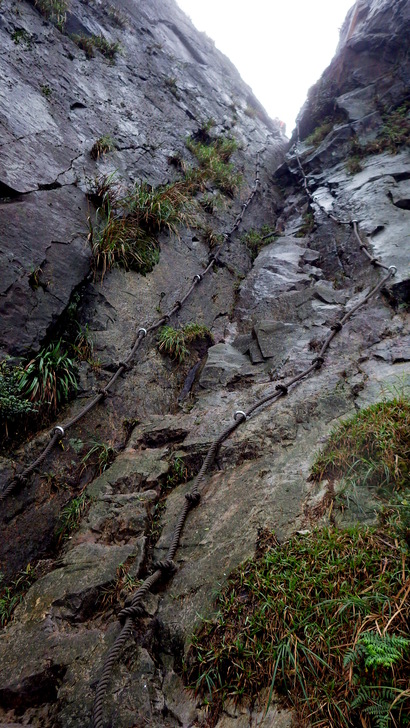 0909巨石拉繩上(H415M)。山區開始起霧。路ㄟ一點耽心,這節骨眼如果下雨,前方路將會更危險,默禱老天幫幫忙,讓路ㄟ至少走完這一段再下,續循瘦稜緩慢前進。