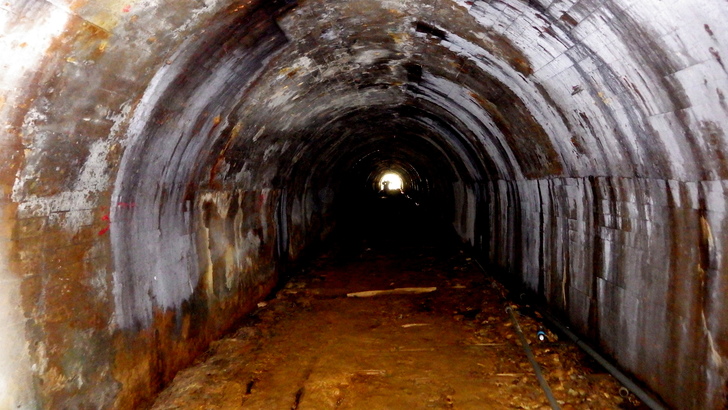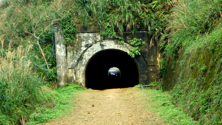 1208過山洞(H160M)。打開頭燈慢行。潮濕的山洞雖可看見對面的光線,不平的路徑還是開啟頭燈照明比較安全。