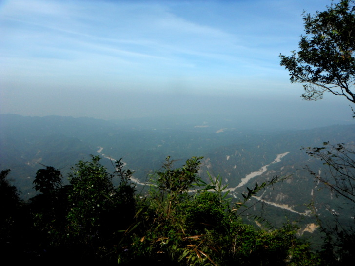 0940登頂暗影山(H975m,記:997m,不做高度校正)。沒想到這小九嶂之一的山峰,竟莫名其妙的登頂了。拍完基點照,喝口水。有180度的展望,只是今天雖然好天氣,空氣品質卻極度不良,原本該有的展望,卻處處顯得灰濛,讓景色遜色不少。