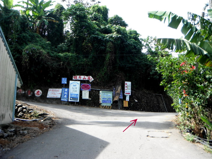 至叉路,左有山社布條,右有"酒桶山休閒園區"指標,路ㄟ取右行,順"酒桶山"指標,車停"步道登山口"。