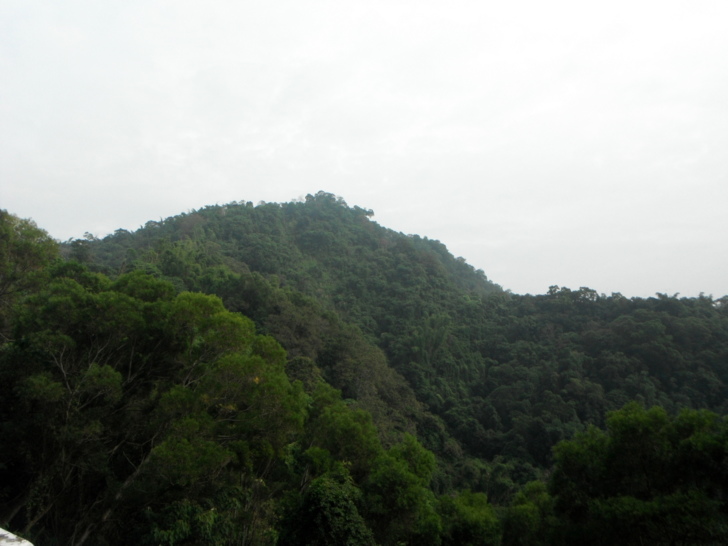 1225台灣潭展望台(H210m)。有不錯的展望,只是還是灰濛,山坳處有一深潭,形狀不俗,路ㄟ卻是怎麼看都不像"台灣",心中有些許疑惑。展望台前有叉路,指標"左往長青運動廣場,直往第二步道",取直行,階梯陡上,開始會有喘的感覺,放慢腳步慢行。