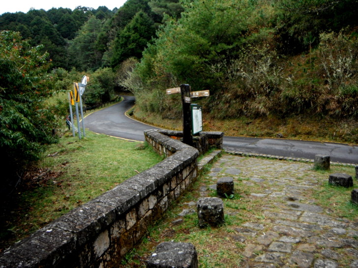 1225接柏油林道叉路(H2630m)。右下是塔塔加小隊,登玉山搭接駁車的地方,取左行。霧氣此刻又籠罩了過來,路邊幾株楓紅,雖然美麗,少了光影,感覺失色不少。