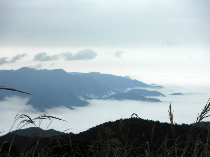 1323登頂麟趾山(H2805m,記載標高2854m)。前峰若隱若現,玉山避不見客。東埔山方向的山谷裡,出現漂亮的雲海,整個山頂四周,充滿迥異的風光,寒風中,有景如此,又是一鎮記憶體的消耗,反而沒有冷的感覺。