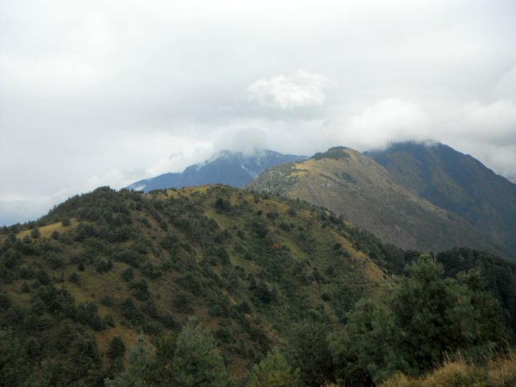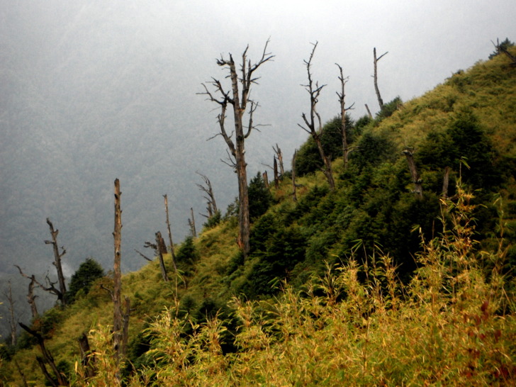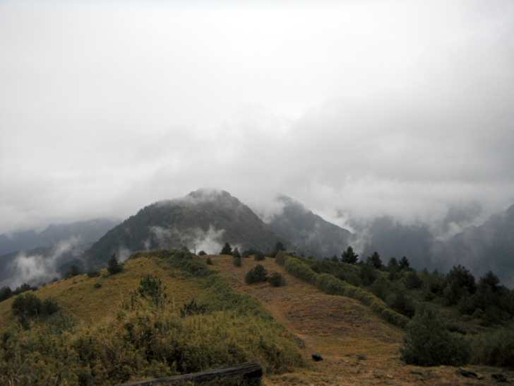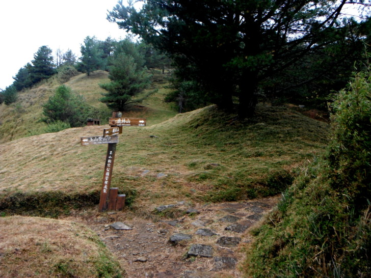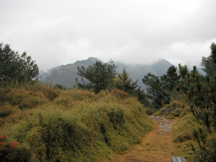 1230大鐵杉叉路(H2665m)。右往鹿林山莊,是遊客走訪鹿林、麟趾的傳統路線;左往玉山登山口。取左行,仍是迷霧中,偶現的玉山前峰,也是稍縱即逝,走的路ㄟ有點悶。