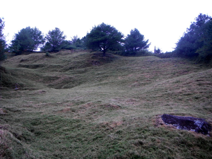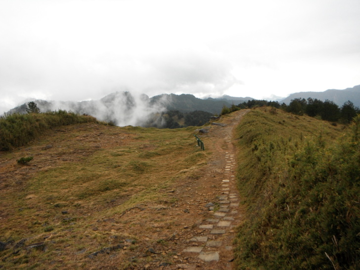 1354叉路(H2690m)。右下接鹿林山莊、大鐵杉柏油路,取直行,指標"鹿林山1.2k"。緩上坡。又開始飄下霧雨,連綿的草坡,在霧雨中行走,別有詩意。
