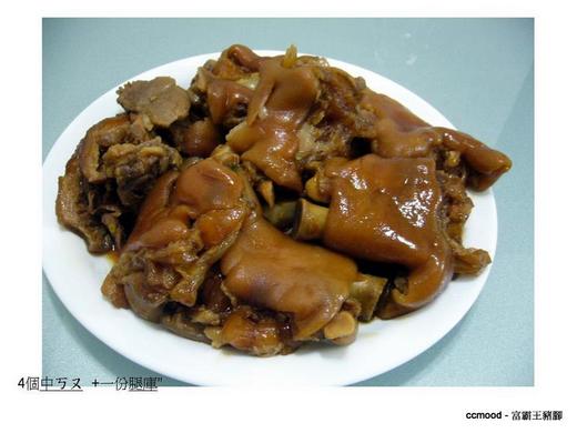 排隊時就一直在想那我要外帶什麼呢?外面招牌只寫著各式便當的名稱&價錢並沒有單點的項目啊!也不知道份量如何?當老闆問我要點什麼時還真的腦袋空白,這時想起前一個客人點了4個中ㄎㄡ(不是腳蹄,豬腳的中段部分)便當,於是我就跟著說單點”中ㄎㄡ”、要幾個? ” 4個”、要不要切? ”要”;覺得難得來此,所以又加點了一份”腿庫”。這時才心滿意足提著一帶重重的、香噴噴的豬腳回家,不過還真的是對不起捷運搭同車廂的乘客們,因為讓他們在飢腸轆轆的下班時刻,忍受那濃濃的香味。