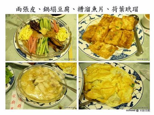 這一天帶著期待的心情來到宋廚,等了這麼久除了預訂的烤鴨外,當然也點了很多道主廚推薦的菜:兩張皮、酸白菜豬肉炒粉絲、糟溜魚片、鍋塌豆腐味道都很好,韭菜盒(要預訂)和蔥油餅也很香不油膩,而炸丸子和椒麻管脡就比較一般了;可惜的是老闆說人力的關係已經不做地瓜拔絲了。