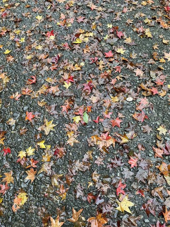 時值歲末,楓樹下,許多落葉被雨淋濕,散發說不出的詩意,美得令人沈醉。