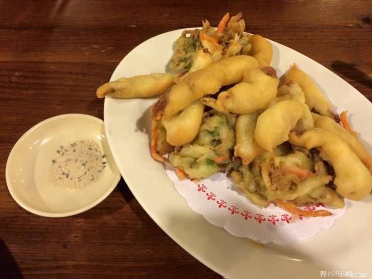 炸雞卷配有豆枝、香菜,沾甜辣醬。宜蘭招牌小吃卜肉,裹粉油炸,紅糟味稍淡;搭配的雜菜天婦羅,偏甜;調味粉添加黑芝麻和白芝麻,足見商家之用心,我喜歡。