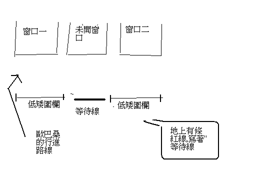 我沒有再回答任何話,因為她這番話真是裝肖偉,同時有二人一前一後進門,一前是她直接走到空窗口,而且還沒有經過排隊線哩,另一個晚她一步的人是走到我後面排隊哩。我們台灣在人文素養上已經越來越進步,大家在排隊這部分已經很少有令人生氣的事,不過偶爾還是有這種小插曲。