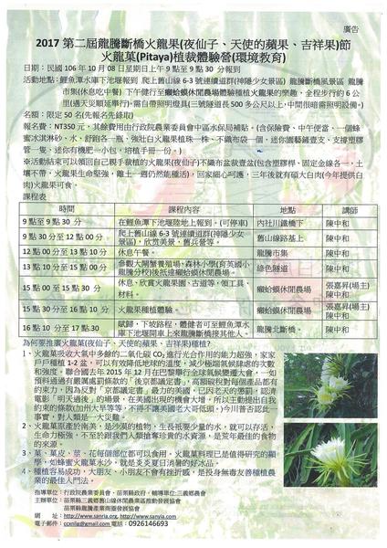 本台鑑於火龍果(夜仙子)對人體保健及光合作用的強大,吸收空氣中二氧化碳功能強大,對激烈的氣候變遷有緩和的作用,所以本台協助苗栗龍騰產業商圈發展協會舉辦2017 年第二屆龍騰斷橋火龍果節,請詳閱DM簡章後,歡迎報名參加。