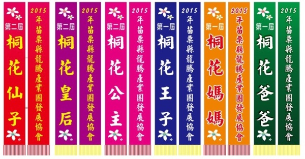 民國104年4月26日星期日在苗栗縣三義鄉龍騰斷橋舉辦「2015客家桐花祭落英繽紛舊山線鐵桐花深度之旅」重頭戲就桐花仙子、桐花皇后、桐花公主、桐花王子、桐花媽媽、桐花爸選拔,其象徵榮耀彩帶先發表如下,竭誠歡迎閣下闔府參加:
