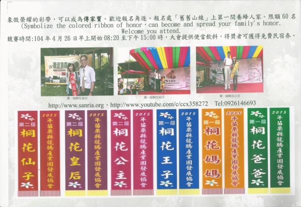 象徵榮耀的彩帶,可以成為傳家寳。歡迎報名角逐。報名處「舊舊山線」上第一間養蜂人家。限額60名