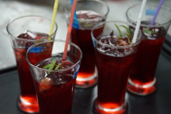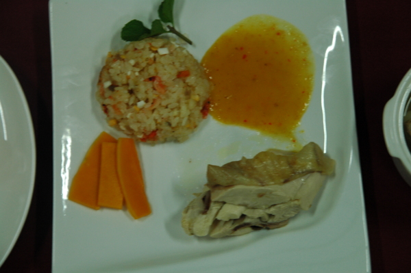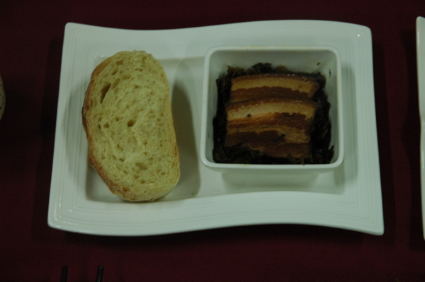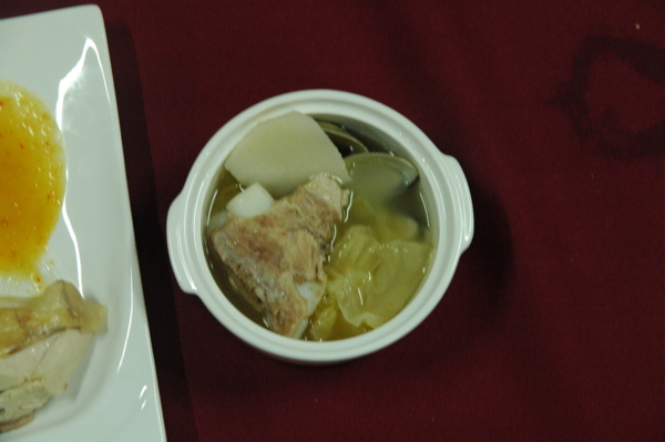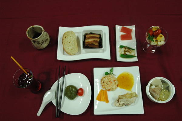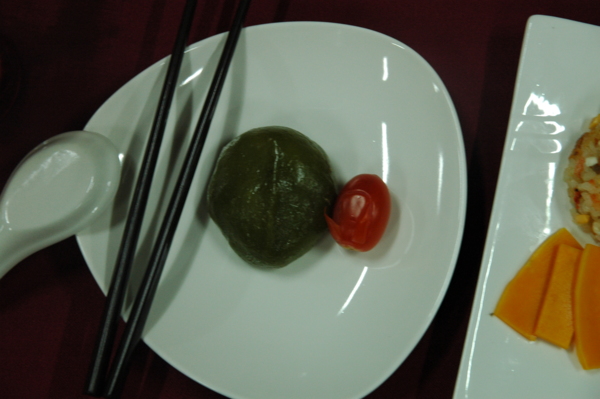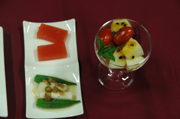 第二道則為南瓜果凍冷盤,除了二片鮮紅果凍外,再加二條綠秋葵、綠竹荀、夾荳等山珍、火龍果肉等應時水果。