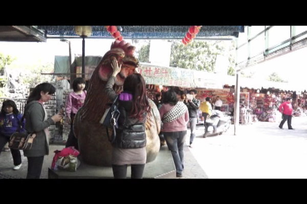 撫摸金雞可以發財,所以大小女生爭相繞行一圈。