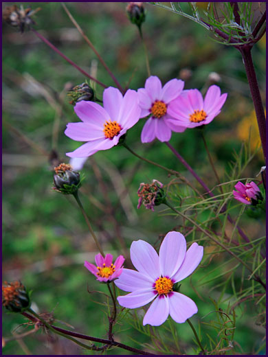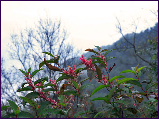 屋旁,乍紅的楓,晃在有點涼的風裡,不覺是秋深的山裡,清清爽爽。一旁,鮮放的野花,招搖冬裡難尋的偶來陽光,和西天一片剛現的霞紅,告訴我,今天的拜訪是老天的恩賜。