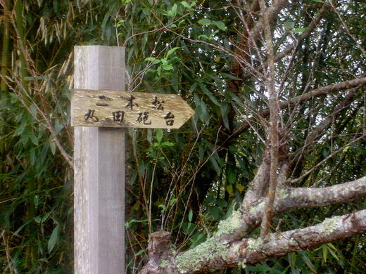 走下觀景台,原本要去丸田炮台看看是什麼,但走到木階的底層仍未看到炮台,而做罷,但在竹林中卻能怡然自得,體會一下什麼是紫竹林中觀自在的真義。看到小徑邊有一個很古老的告示牌,那個少說也有五十年左右的歷史,但已沒入草叢中,告訴孩子那是歷史,也是我們必須崇敬的文化。