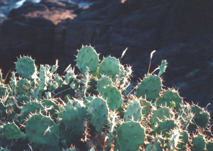澎湖仙人掌,常綠肉質性灌木,海崖野地隨處自生,分佈極廣,原產於新大陸(洪國雄老師「鹹水煙下的澎湖植物」則曰:1645年由荷蘭引入)。莖,行光合作用之主要器官,肥厚扁平,多節互連生,掌狀,綠色;葉,退化若針,棘針一至五枚,淡黃,長短不一,有保護作用;花,長於節片上方,色黃,長年可開;果則漿果,橢圓,花托膨大而成,內有堅硬種子。