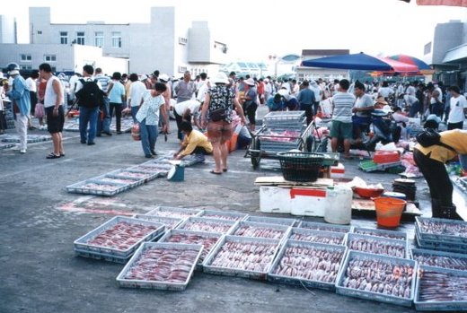 今者,人們起個絕早,亦有遊人聞風,如同趕集,紛紛閒步第三漁港,逛「漁港早市」,購「新鮮魚貨」。聽!魚販吆喝頻頻,看!海錯橫豎上攤。顧客眼眸明亮,駐足精挑細選,一攤接著一攤,到處覓覓尋尋。土托、紅蟳、石斑、青嘴、嘉臘、龍尖、花枝、石久,應有盡有。賣者慇懃叫喚,買者計量鮮好。篩去翻來,有如選美;交易完成,打包帶回。包包袋袋,歡喜豐收。逛魚市場,非惟可以健身,買到價廉物美;弗須錙銖計較,其中樂趣無窮,是亦一舉數得也。