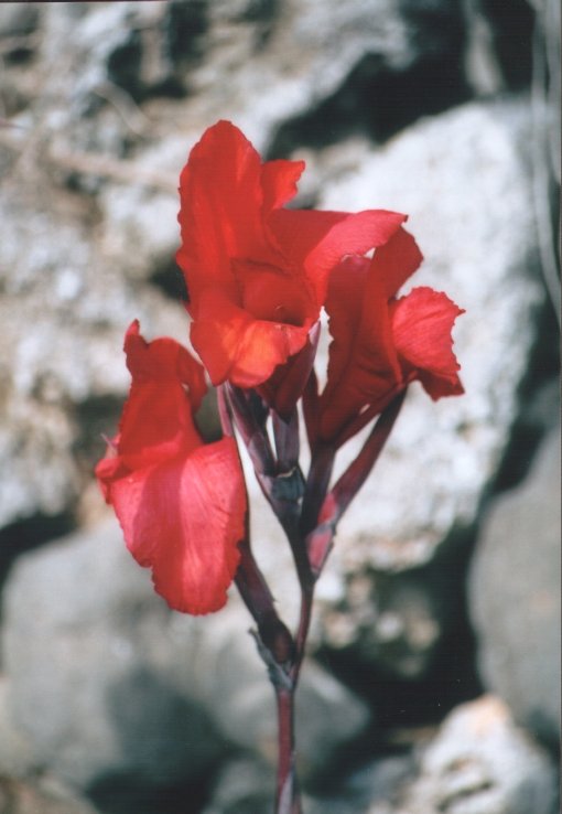 美人蕉為多年生草本,地下莖發達。夏秋開花,花放黃、紅,黃色清麗可人,紅色燦爛奪目;還有朱紅、鵝黃。小花種,開花、結果,週而復始;大花種,色樣豐富,鵝黃之中點點朱紅。蒴果外有小突,熟時三裂,種子圓黑,可作童玩材料。