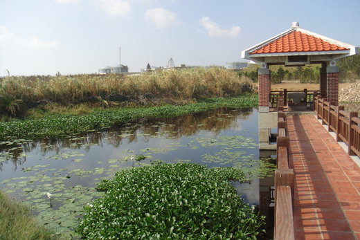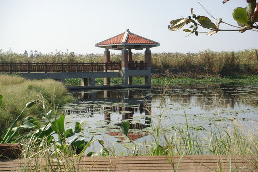 湖西埤塘,塘上築有棧道,棧道步往涼亭,亭上悠閒四望,望去一塘清澈;田田睡蓮,盎盎生趣;風過漣漪,花送清香;魚蛙相戱,蝶鳥來探;天朗氣清,映亭倒影;一幅好畫圖也。