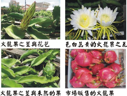 「維基百科」云:火龍果,仙人掌科三角柱屬或蛇鞭柱屬植物,原產於墨西哥、加勒比海、中美洲等地熱帶森林中。于台灣栽培,亦十七、八載矣!果實橢圓乃至卵形,徑十至十二公分。外觀紅色,有綠色圓角三角形突出物;果肉白色或紅色,間有黑籽小而多。火龍果有:龍珠果、紅龍果、仙蜜果、吉祥果...之別稱,亦有金黃白肉者,稱諸「金龍果」或「黃龍果」。