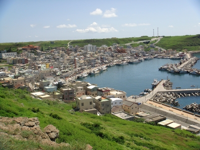 圖下:自「西三仙塔」上,俯瞰外垵漁港及民家
