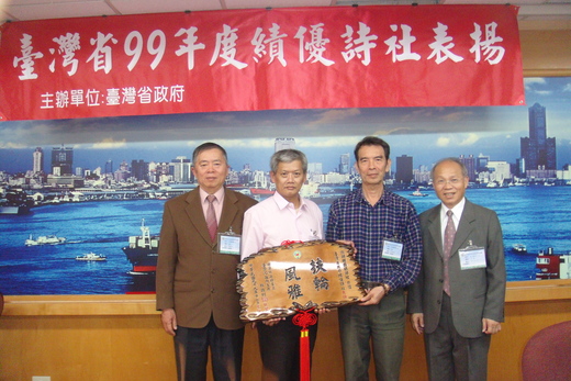 省府推動詩學績優社團及個人表揚活動(南區),民國九十九年十二月七日於高雄舉行。澎湖縣西瀛吟社獲績優社團,謝霞天、國彥與余獲績優個人。是日,謝老未克前往,余偕國彥與陳永堅理事長前往領獎,一日來回。後,永堅賦詩一首,歌吟西瀛吟社創社至今106年;國彥亦作五絕一首,余聞之不敢或怠,即興吟哦初成,不消一刻工夫。乃復推敲,幾度修改,而成之作。(仍尚未定稿)