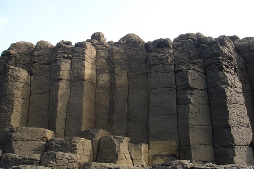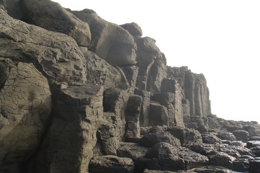到「紫菜礁」,於涼亭前,放眼海闊天空,迎風吹袂清涼,走下「紫菜礁」,眼底連綿風化岩石,或大或小,或高或低,足夠賞其怪狀奇形。一路而下,下了「紫菜礁」,紫菜礁前,大片亂石,亂石巨大,縱橫面廣;步履其間,忽上忽下,步履小心,免生躓踣。走過亂石,柱狀玄岩,雄昂並列,歎為觀止!想見一旁亂石,蓋百、千萬年前崩落。未崩落之柱狀玄岩,柱柱密結,三五柱間,多見「石階」,登上石階,一望石階,石階皆成圓狀,圓狀面廣,狀若蒲團,坐上蒲團,可以禪修,可以冥想。如若好天時節,非是紫菜產期,此處少有人聲,只有鳥聲潮聲,時有迎面清風,時看激礁怒潮,浪花飛奔,氣象萬千,真如東坡居士所云:「驚濤裂岸,捲起千堆雪,江山如畫」!