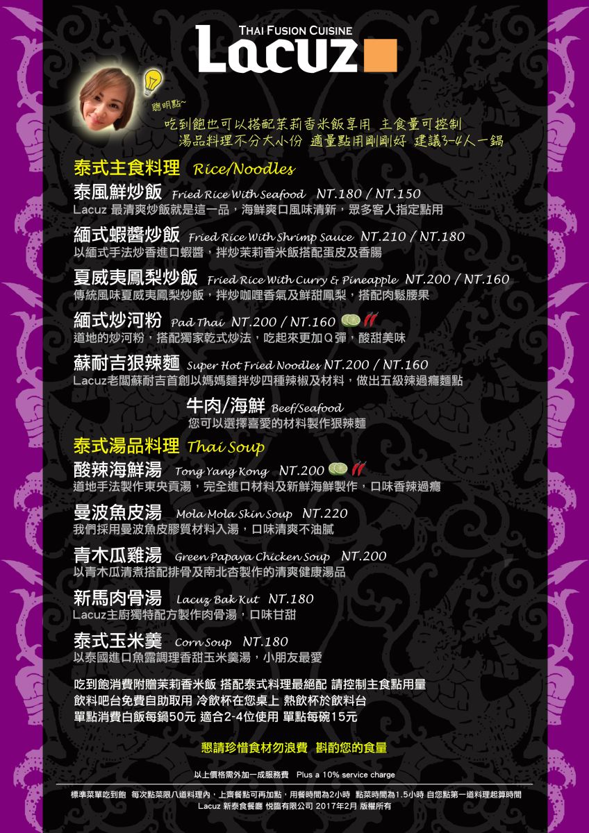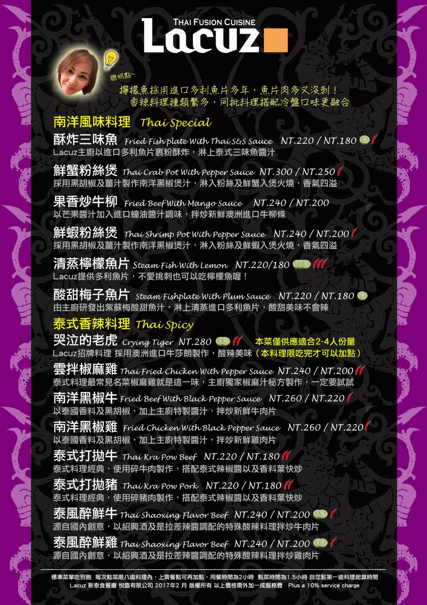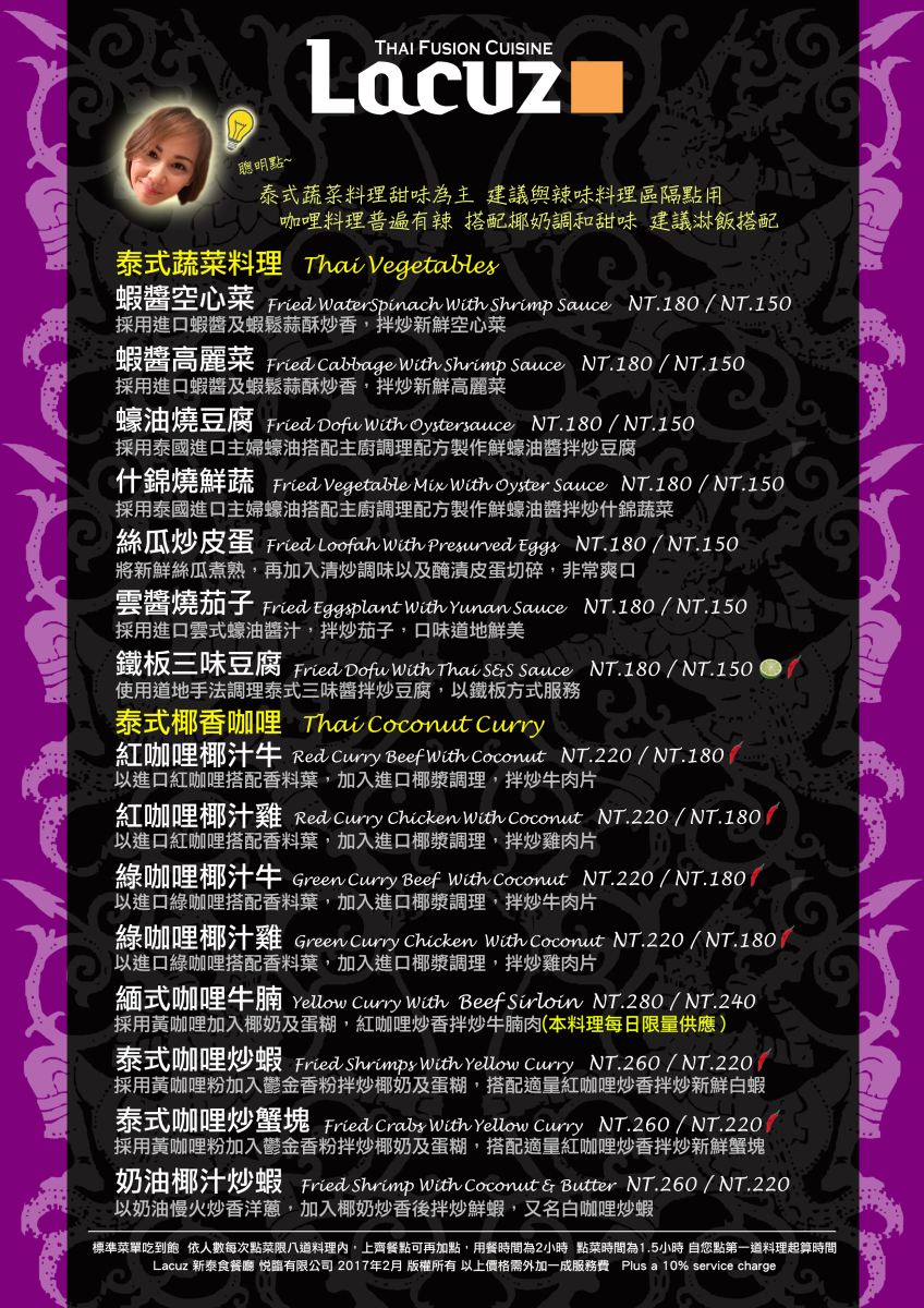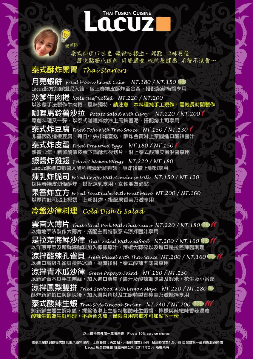 泰國料理深受周邊國家影響,包含馬來西亞、新加坡、越南、緬甸、雲南等多元混合,呈現豐富的樣貌.泰式料理的特有歷程,成為【Lacuz】設計料理的核心價值.採用泰國進口調味品,包含魚露、蠔油、蝦膏、紅綠咖哩等,維持泰式道地風味,搭配各種手法與食材,以不同國家的風格融合一系列的泰風創意。