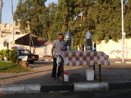 我們很喜歡去探訪住在Shobra的一位親戚。那日受邀去同進Iftar,日頭已經西斜,途經的路上,看到許多人把門口的陶罐加滿了水給開齋時候過路人喝。賣飲料、賣大餅、賣水果、賣醃菜的攤子前擠滿了人,採購待一會兒開齋的食物。我到現在還是不解為什麼埃及人要在禁食結束的時候,喜歡吃鹹死人的醃菜,那不是讓人更為口渴?尤其是醃鹹檸檬,那種沒法形容的又酸又鹹,我覺得是找罪受!但是埃及人可不這樣認為。
