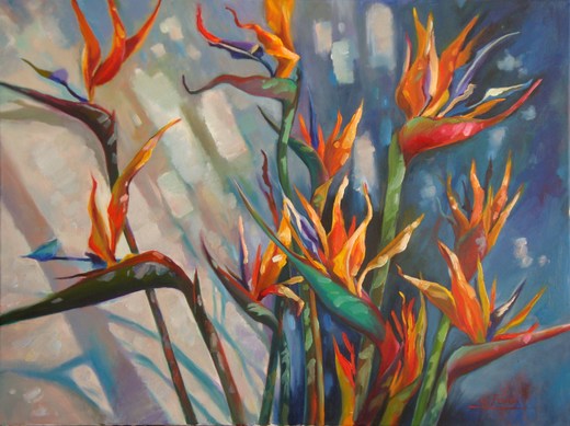 她的畫是由上面得到的亮光而化為形象,反應在畫布上。是一種淡淡的藍調裡出現的一抹橘紅,是充滿喜樂、正向、健康、美麗的。是祝福滿滿的,是更深刻更確認生命是可愛可敬的。
