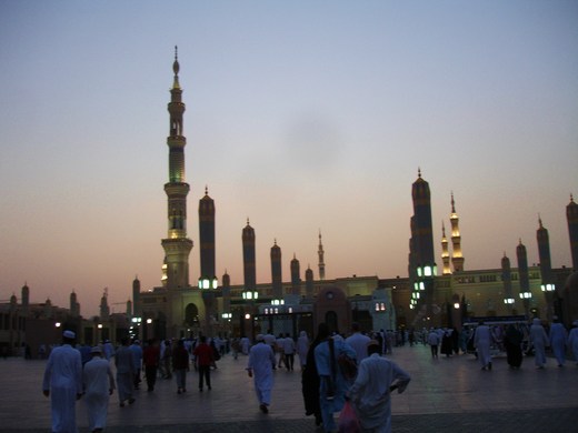 小淨後,去麥地納的大寺作昏禮。這寺外觀漂亮極了!因為麥地納並非朝覲必修功課,來麥地納的人沒有麥加多。又因緯度較高,天氣比麥加涼爽許多。看到寺外的大理石地上坐了不少禮拜的女人,想必寺內已人滿,我找了位子坐下,天氣舒服極了,禮拜非常適意。這裡禮拜一拜等於一千拜。