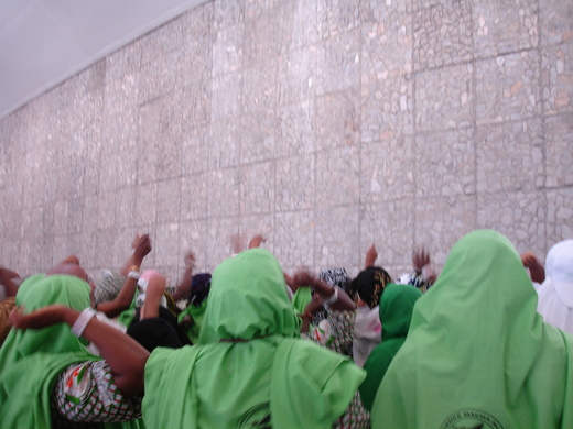 跟著國旗浩浩蕩蕩出發了。直上三樓,電梯又高又長。依次行過小魔鬼、中魔鬼,最後面是大魔鬼石牆。時間還早,人沒我想像的多,今天用七顆石子打大魔鬼。石牆外週邊用海綿包覆,萬一石子掉在外面,也不會彈出傷人。每個人像孩子般快樂地數著手裡的石頭:「1、2、3、4、5、6、7」。一面丟一面唸:「Alaah u Akbar」(真主至大)。呵呵!我臂力不錯!每顆都有打中。