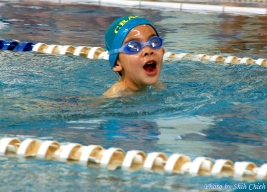 幼稚園兩年之間,小孩學會了自由式、仰式、蛙式和潛水,蝶式則是在入門階段。小孩在成果展中,表演蛙式25公尺,淘氣的他在抬頭換氣的時候,居然還露出笑容,好像在跟我們打招呼咧!
