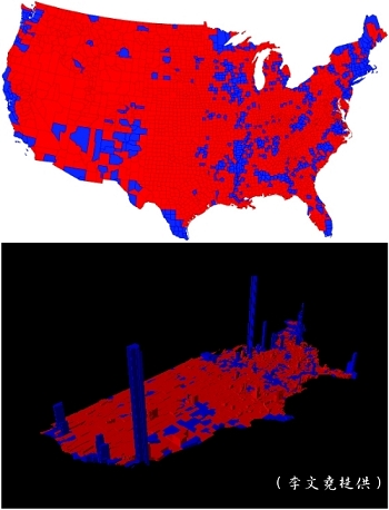 下圖一: 美國兩千年總統大選,「二分法」式的的兩黨候選人勝選區域分布圖,顯示共和黨布希(紅色)呈現壓倒性勝利(上);但落選的民主黨高爾(藍色)得票數其實更多。李文堯利用地理資訊系統繪製立體圖,解釋這種「得票多卻落選」的現象(下)。李文堯/提供