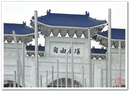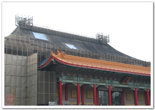 下圖一:兩廳院外觀刻正整修中,原本華麗的外表,硬被貼了兩張狗皮膏藥,整個中正紀念堂完全是一副破敗荒蕪的氣氛。