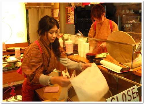 由於要當一個聽話的觀光客,我就必須看著這群年輕女孩兒打烊前:收什物的收什物、刷鍋的刷鍋,同時還要陪起笑臉應付沒看到打烊招牌的客人。或許在褪下樸素的工作和服之後,她們會換上華麗妖嬈的靚裝濃妝去真正屬於年輕人的地方狂歡—