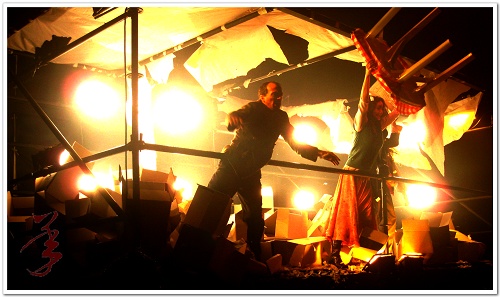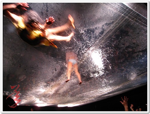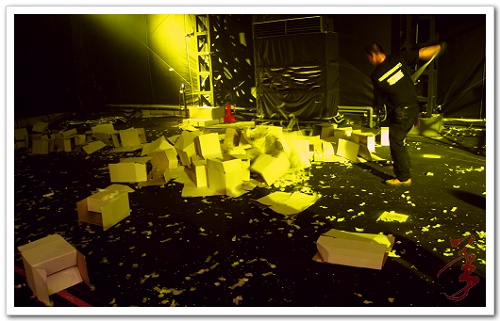 下圖二:被放縱拆解、破壞的牆面都是紙紮道具,工作人員必須立即清除,而表演並不稍歇,立即移位轉向他處繼續進行,這就是極限震撼秀的魅力。(全世界大概只有我這種無聊的人,才會在全場high翻天的氣氛中,拍工作人員清掃的畫面吧?!)