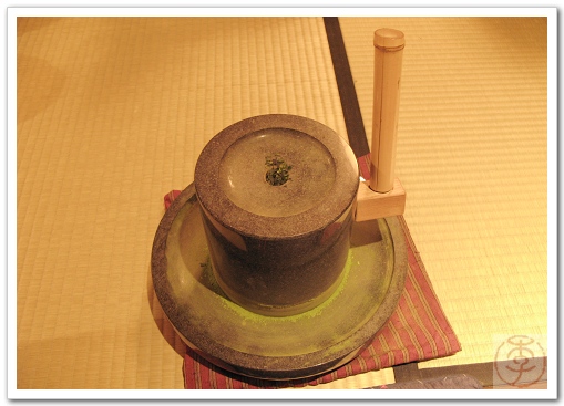 有個早上,我在宇治(京都南方的一個市,當地出產的茶很有名)的一家店裡,上了一堂日式抹茶速成課。一人一個茶碗、一塊和菓子,先把茶葉放進小石磨裡磨成末(見下圖二),放進碗裡,用象印牌熱水瓶沖熱水,再拿竹刷子這麼涮啊涮的,直到涮出泡沫為止(我可以叫它「泡沫綠茶」嗎?!),接著把碗轉兩圈,配著和菓子喝掉。