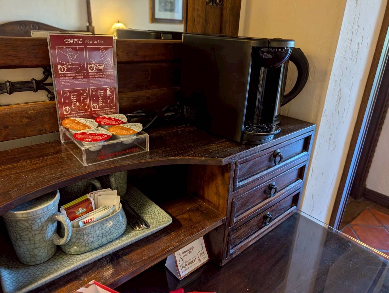 復古古董桌上,擺放了茶包與膠囊咖啡機。