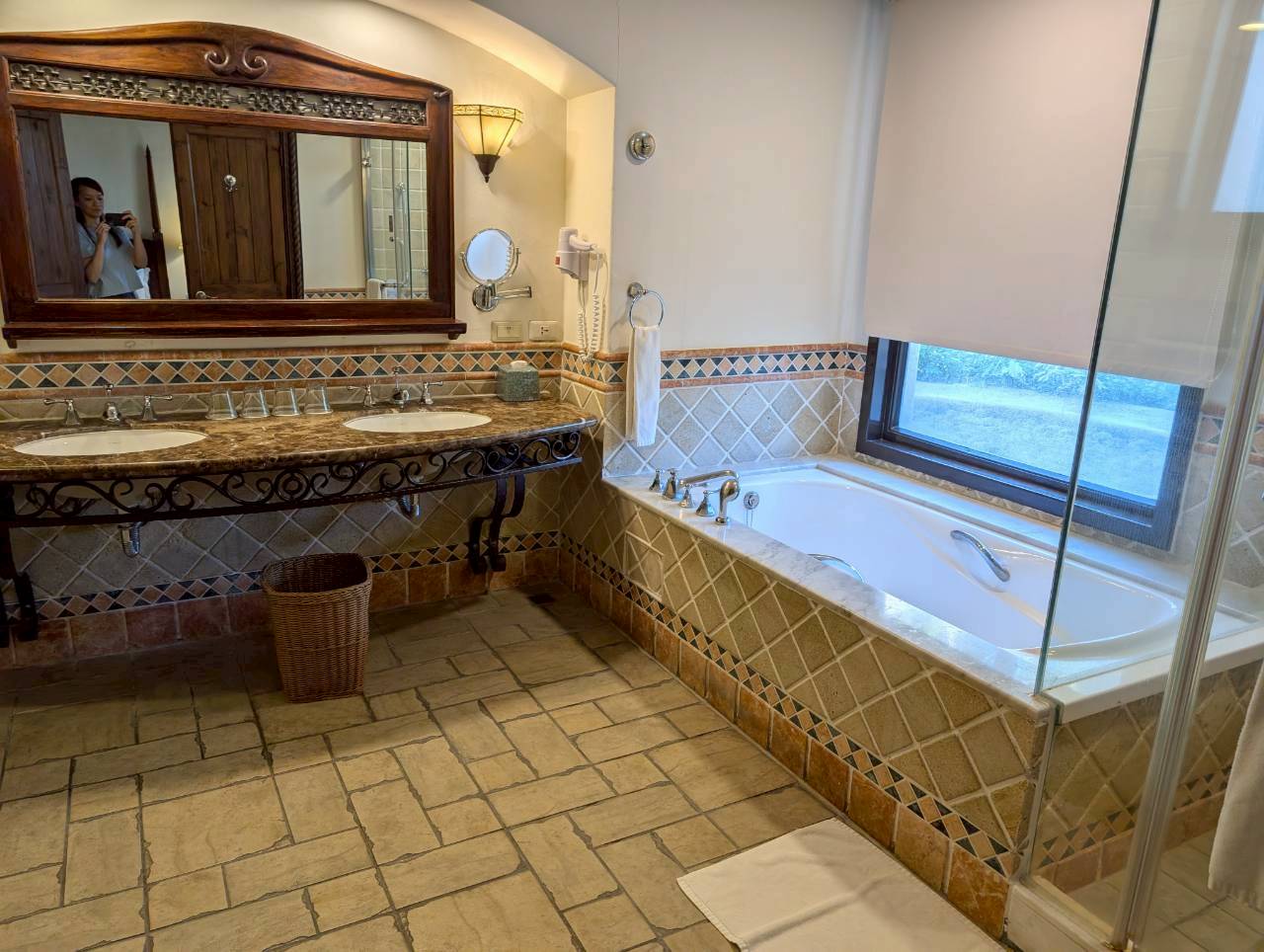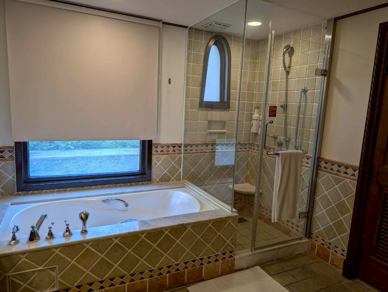 浴缸跟淋浴間在進門的右手邊,浴缸旁邊還有個觀景窗。